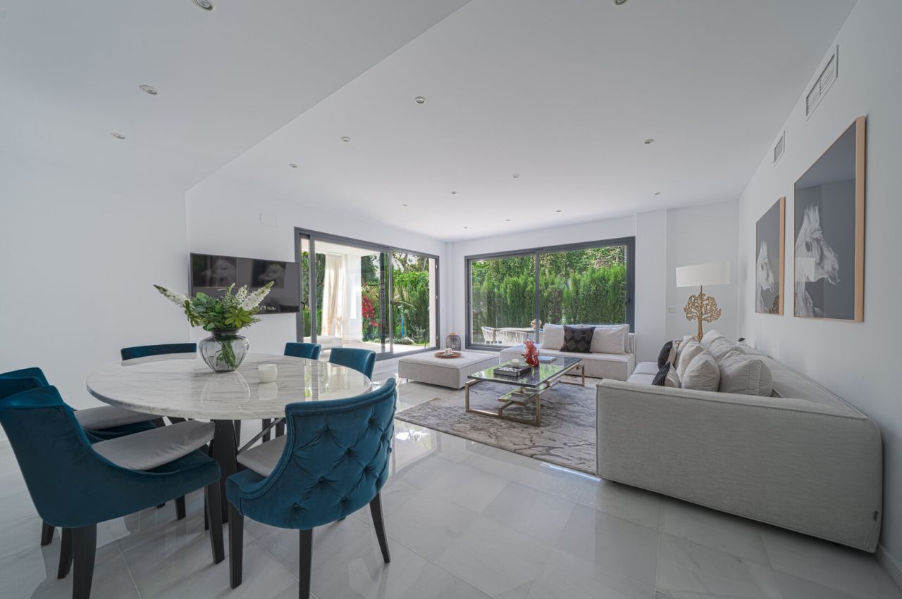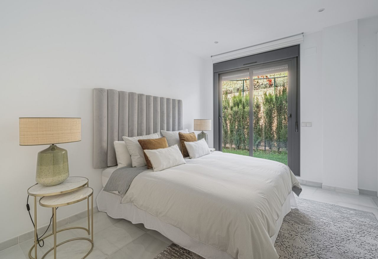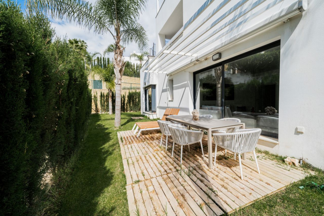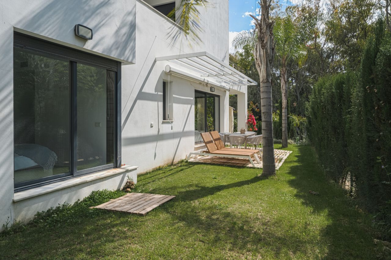 Byt se skládá z prostorného obývacího pokoje spojeného s jídelnou se vstupem na velkou částečně krytou terasu s jídelním koutem, posezením a lehátky; samostatná plně zařízená a vybavená kuchyně s prádelnou; 3 ložnice, jedna z nich s vlastní koupelnou a zbytek sdílí koupelnu; toaleta pro hosty. K nemovitosti navíc náleží prostorná slunná zahrada. 1 parkovací stání a komora umístěná v podzemní garáži. Rezidenční komplex má plně vybavenou posilovnu a bazén. Tento plně oplocený rezidenční komplex byl dokončen v roce 2018 a nabízí společný bazén, kurt na paddle tenis a malou posilovnu.
