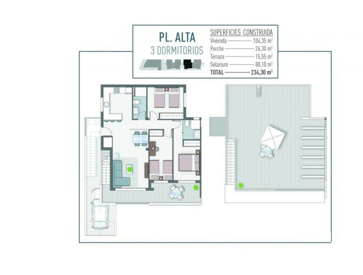 NOVÝ REZIDENČNÍ KOMPLEX V PILAR DE LA GORADADA Nový bytový komplex v moderním stylu skládající se z 8 bungalovů, apartmánů a penthousů se 2 a 3 ložnicemi, s velkou zahradou nebo soláriem. Budova s obchodními prostory v přízemí. K dispozici je také impozantní střešní bazén a garážové stání v suterénu. Komplex se nachází v bezkonkurenční enklávě uvnitř velké rezidenční čtvrti Pilar de la Horadada, privilegované místo pro rodiny se snadným přístupem ke všem typům služeb. Pilar de la Horadada je typická španělská vesnice v nejjižnější části Costa Blanca. Velká hlavní ulice má supermarkety, různé obchody, restaurace a bary a také některá krásná náměstí. Krásné pláže Torre de la Horadada a Mil Palmeras s jemným pískem a promenádou jsou vzdálené pouhých 5 minut jízdy. Letiště Corvera (Murcia) a Alicante jsou vzdáleny 40 a 55 minut.