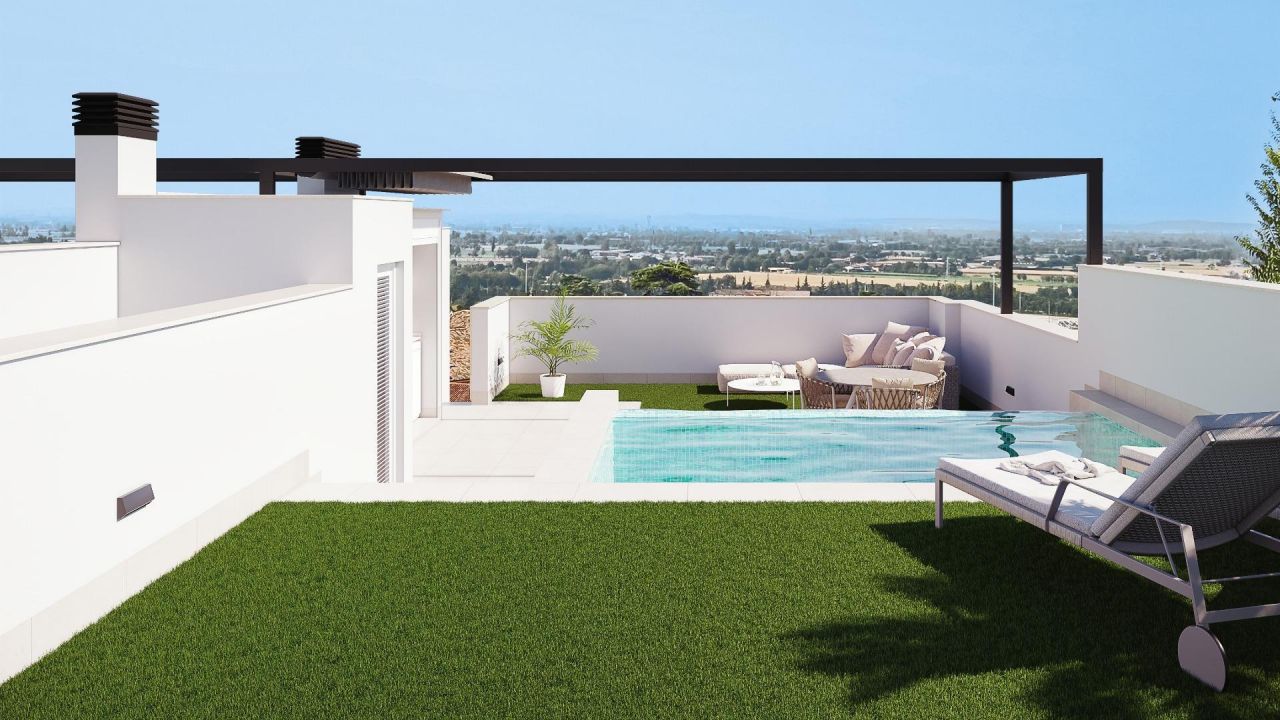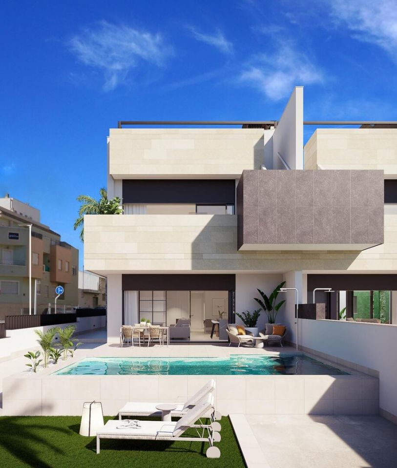 pilar-de-la-horadadaNOVOSTAVBA REZIDENČNÍHO BUNGALOVU V PILAR DE LA HORADADA Exkluzivní moderní apartmány v bungalovech v Pilar de la Horadada. V přízemí jsou přední a zadní terasy s vlastní zahradou, bazénem a parkovacím místem. V nejvyšším patře je velké střešní solárium s bazénem, WC, venkovní kuchyně, umělá tráva a altán, vše v ceně bytu. Všechny bungalovy mají 3 ložnice, 2 koupelny, z nichž jedna má vlastní koupelnu s hlavní ložnicí, prostornou otevřenou kuchyni/obývací pokoj s plně vybavenou kuchyní včetně všech spotřebičů a značkovou lednicí na víno Bosch/Siemens a čističkou vody v kuchyně. Hlavní ložnice má velké skříně se skleněnými dveřmi a vnitřními zipy. Koupelny jsou plně zařízené a mají podlahové vytápění. . V obývacím pokoji jsou velká posuvná okna otevírající se na terasu, kterou lze zcela zapustit do stěny a vytvořit tak v bytě neuvěřitelný prostor. V celém bytě je klimatizace a elektrické žaluzie na všech oknech. Všechny materiály jsou nejvyšší kvality a samotný projekt má jedinečný a exkluzivní design. Všechny domy mají vlastní parkovací místo. Pilar de la Horadada je typická španělská vesnice v nejjižnější části Costa Blanca. Velká hlavní ulice má supermarkety, různé obchody, restaurace a bary a také některá krásná náměstí. Krásné pláže Torre de la Horadada a Mil Palmeras s jemnou písečnou promenádou jsou vzdálené pouhých 5 minut jízdy. Letiště Corvera (Murcia) a Alicante jsou vzdáleny 40 a 55 minut.