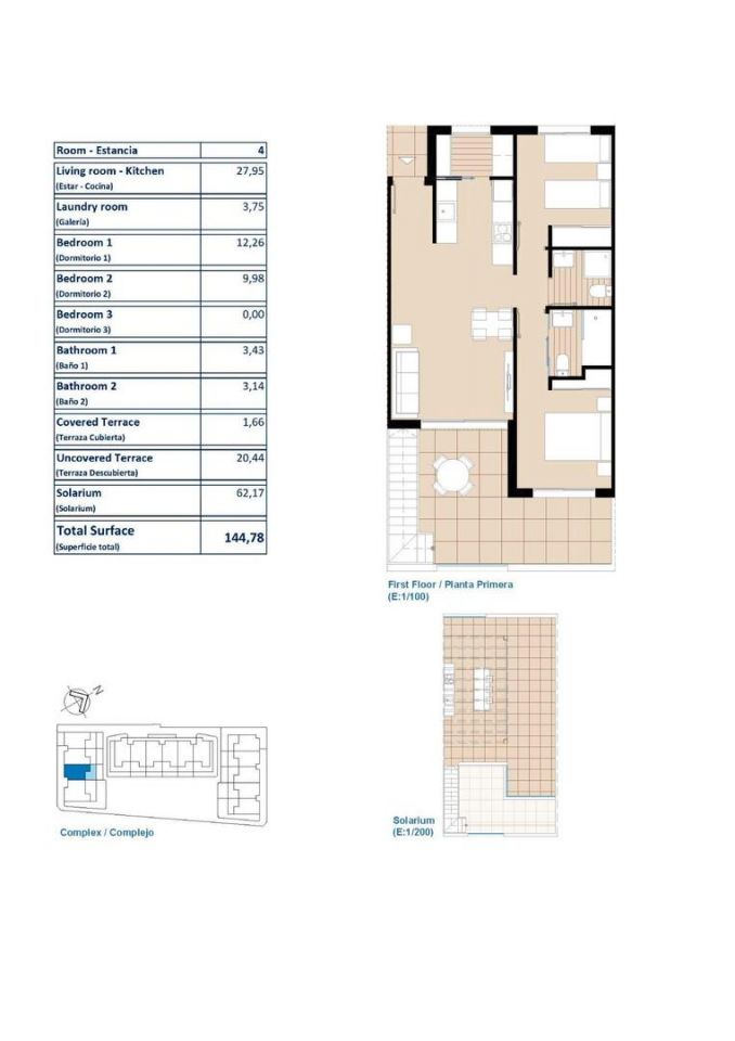 Moderní rezidenční komplex v Pilar de la Horadada Stylové bydlení v srdci Costa Blanca Objevte nově postavený rezidenční komplex v Pilar de la Horadada, který nabízí dokonalou kombinaci moderního designu a pohodlí. Tento exkluzivní komplex nabízí bungalovy, apartmány a penthousy navržené podle nejvyšších standardů současného bydlení. Různé možnosti bydlení Vyberte si ze dvou a třípokojových apartmánů pro různé životní styly: Bungalov v přízemí: Užijte si soukromou zahradu pro venkovní bydlení. Apartmány na středním patře: Prostorné terasy pro stolování pod širým nebem. Penthousy: Soukromá solária s úchvatným výhledem. Ke každé jednotce patří garážové stání a sklepní prostory pro pohodlí a bezpečnost. Prémiové funkce a vybavení Tyto domy jsou vybaveny prémiovým vybavením, které zlepší váš životní zážitek: Termoakustické bezpečnostní sklo od ClimaSun. Zesílené vstupní dveře pro větší bezpečnost. Vyhřívané podlahy ve všech koupelnách. Aerotermální systém horké vody pro lepší energetickou účinnost. Předinstalované potrubní klimatizační a topné systémy. Společný bazén, jacuzzi, posilovna, upravené zahrady a dětský koutek. Výtahy v obytných domech spojující všechna podlaží od suterénu až po penthousy. Po omezenou dobu jsou v pořizovací ceně spotřebiče, koupelnová zrcadla, sprchové zástěny a vestavné osvětlení, které zhodnocují vaši investici. Výhodná poloha v Pilar de la Horadada Tento rezidenční komplex má ideální polohu v klidné a rodinné čtvrti Pilar de la Horadada. Město má rušnou hlavní ulici se supermarkety, obchody, restauracemi a půvabnými náměstími. Pláže: Torre de la Horadada a Mil Palmeras jsou vzdálené pouhých 5 km a nabízejí písečné pobřeží a malebné promenády. Letiště: Letiště Murcia-Corvera je vzdálené 40 km a letiště Alicante 55 km. Golfová hřiště: Několik vyhlášených golfových hřišť se nachází v okruhu 15 km. Nákupy: Oblíbené nákupní centrum Zenia Boulevard je vzdáleno pouhých 15 km. Přístavy: Přístav Torre de la Horadada je vzdálený pouhých 5 km. Čeká na vás váš vysněný domov Zažijte to nejlepší ze života na pobřeží Costa Blanca v tomto moderním rezidenčním komplexu. Naplánujte si návštěvu ještě dnes a najděte svůj dokonalý domov v Pilar de la Horadada!