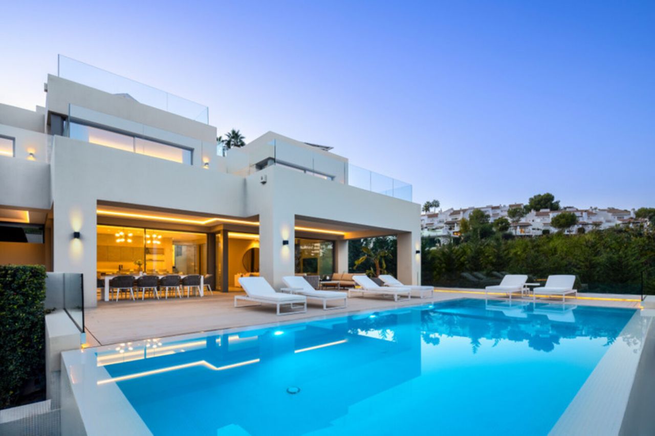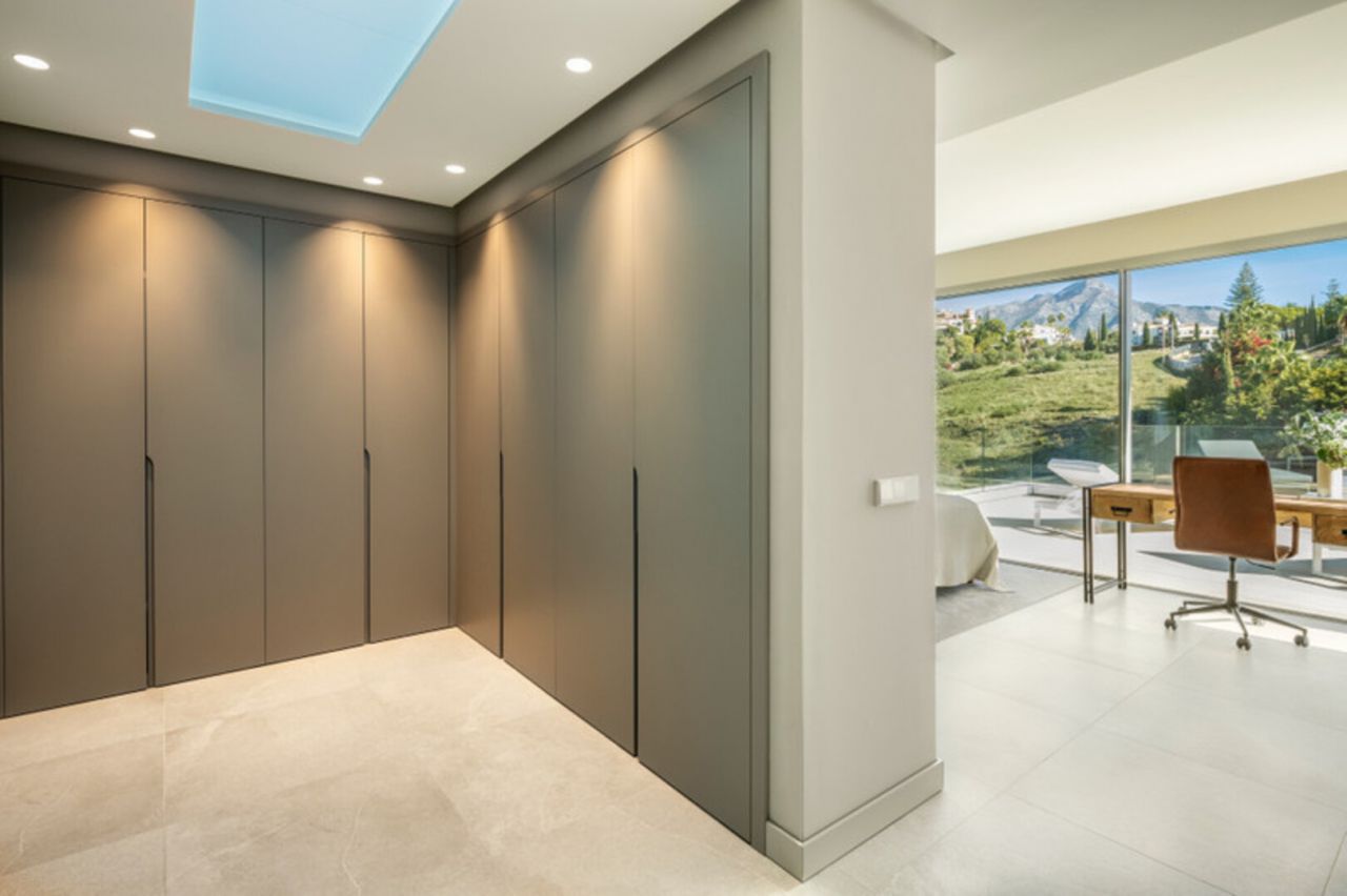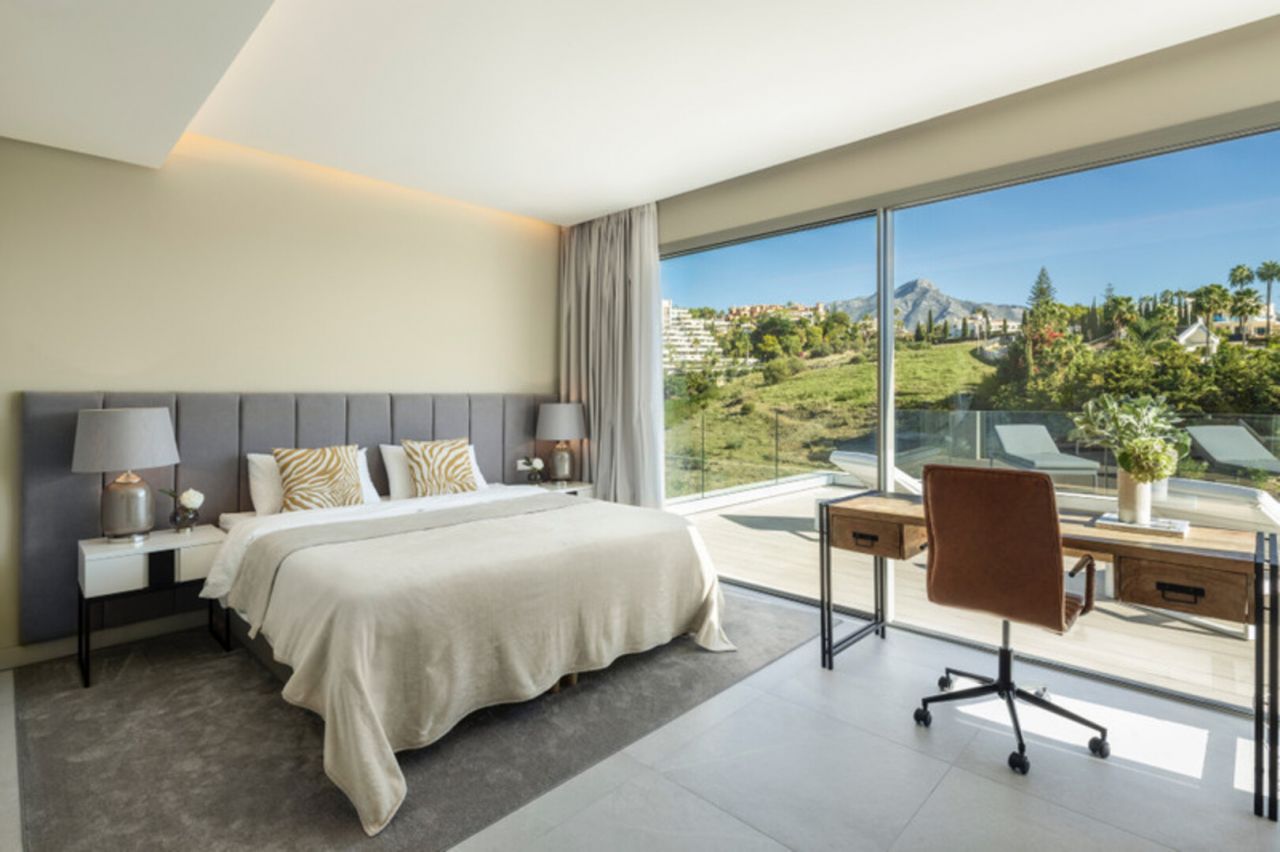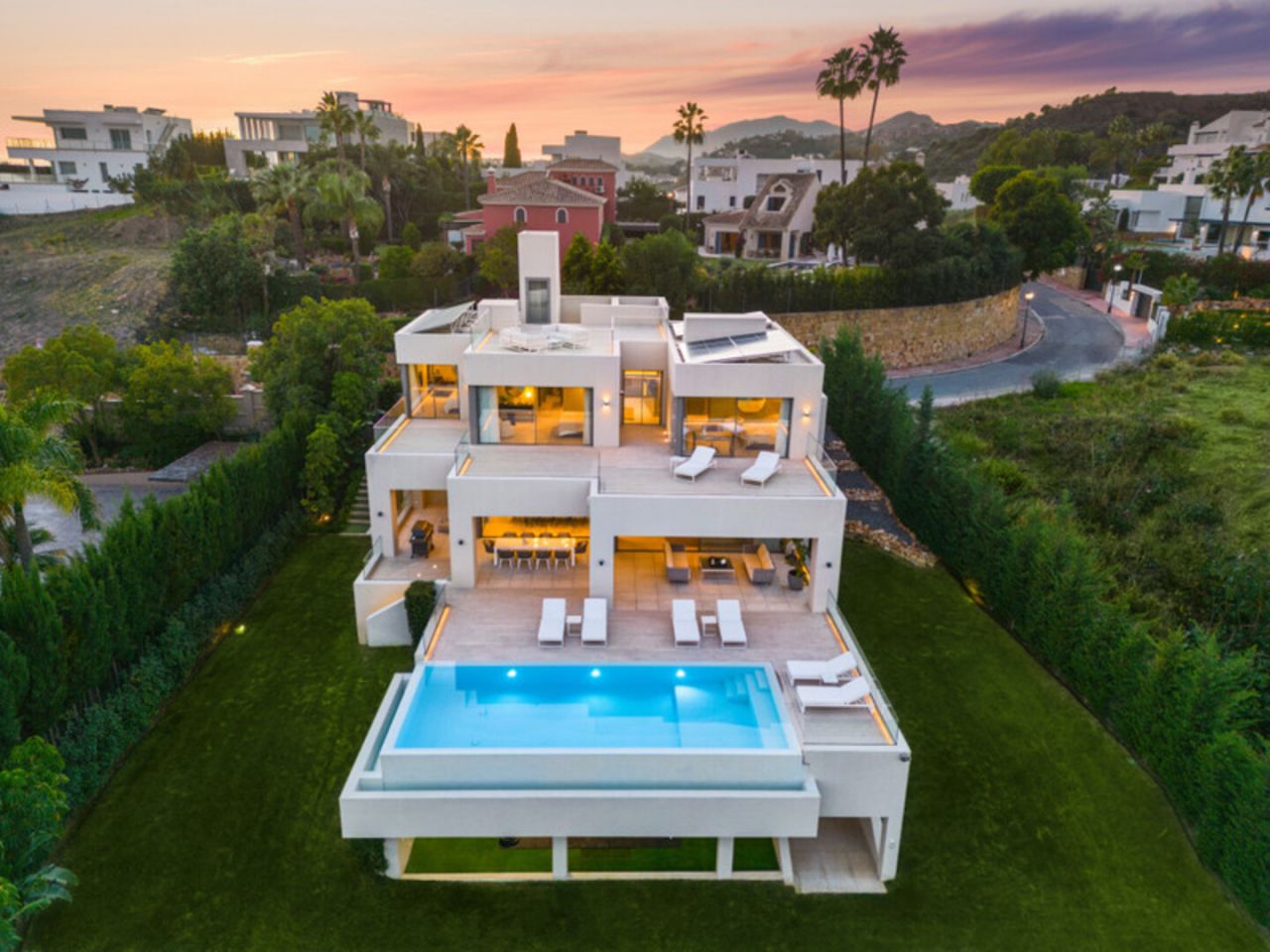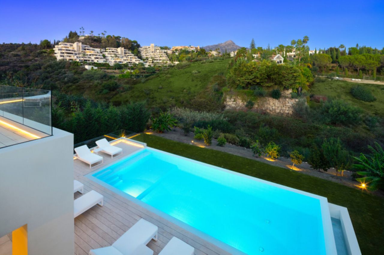 Zázrak moderní architektury, ideálně umístěný v prestižní oblasti Nueva Andalucia. Tato neuvěřitelná rezidence má východní orientaci, poskytuje dostatek slunečního svitu po celé dopoledne i odpoledne a také úchvatný výhled na okolí a majestátní horu La Concha. Villa Miranda se nachází na rozlehlém pozemku a nabízí prostornou terasu pro snadné stolování pod širým nebem, relaxaci a opalování, zatímco impozantní nekonečný bazén s nulovým okrajem dodává luxusu venku. Sluneční místnost v nejvyšším patře nabízí panoramatický výhled a vytváří další prostor pro zábavu a relaxaci, zatímco krytý přístřešek pro auto u vchodu poskytuje další pohodlí. Vstupte dovnitř a uvítá vás neposkvrněný interiér, který se vyznačuje otevřeným půdorysem v přízemí, který plynule propojuje různé obytné prostory. Integrace krásného LED stropního osvětlení a tlumených tónů do interiéru vytváří uklidňující a relaxační atmosféru. Skleněné posuvné dveře od podlahy až ke stropu vedou na palubu a poskytují vynikající bydlení uvnitř i venku. Kuchyně na míru, zdobená dřevěným truhlářstvím, tlumenými šedými skříňkami a kuchyňským ostrůvkem, je vizuálně přitažlivým a funkčním prostorem s dostatkem úložného prostoru a pultu. Díky moderním kuchyňským spotřebičům je vaření ještě pohodlnější. Horní patro je věnováno elegantně vybaveným ložnicím, hlavní ložnici s nádhernou šatnou a luxusní hlavní koupelně. Koupelna je vybavena dvojitým umyvadlem s LED osvětlením, samostatnou vanou a sprchovým koutem, čímž je zajištěna vysoká kvalita interiéru v celém domě. Hlavní ložnice vyzařuje styl a pohodlí s přímým přístupem na terasu a úžasným výhledem do okolí. Mezi další domácí vybavení patří venkovní posilovna, místnost s golfovým simulátorem, domácí kino a zábavní místnost, což přispívá k ztělesnění luxusního bydlení.