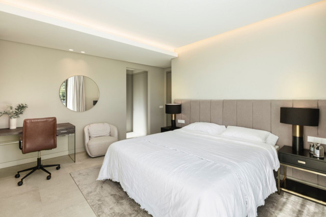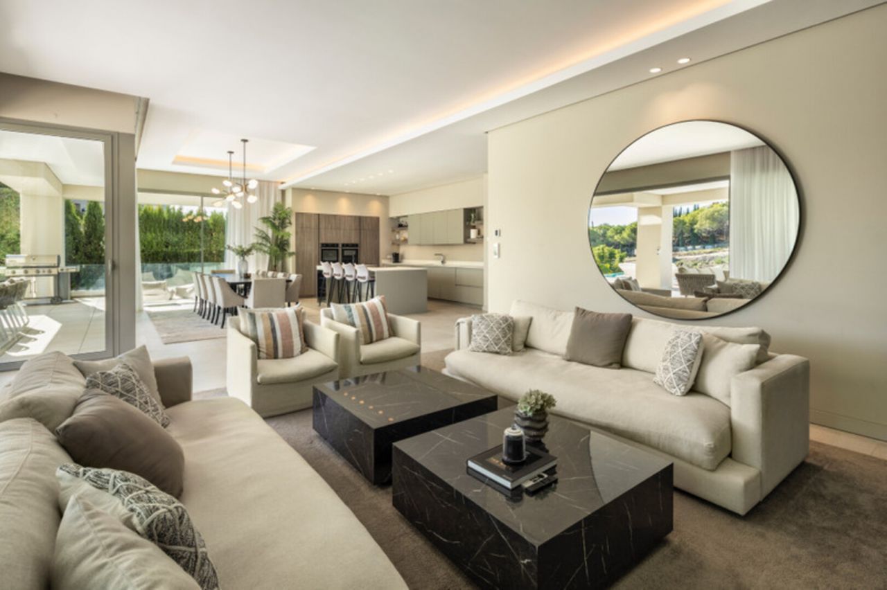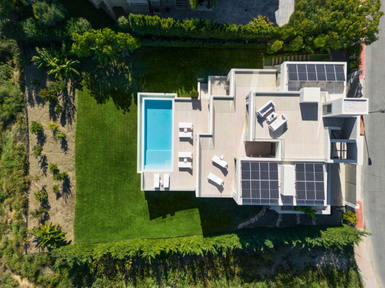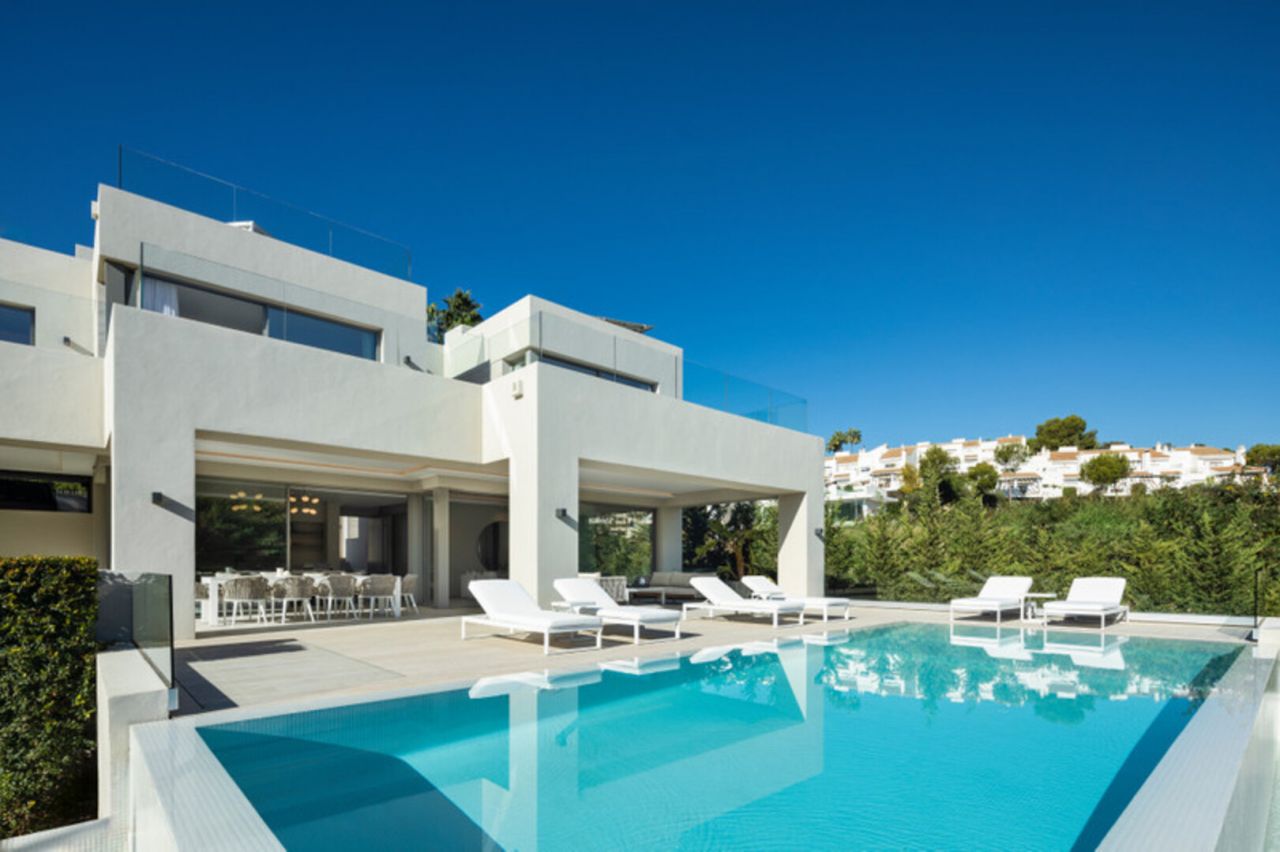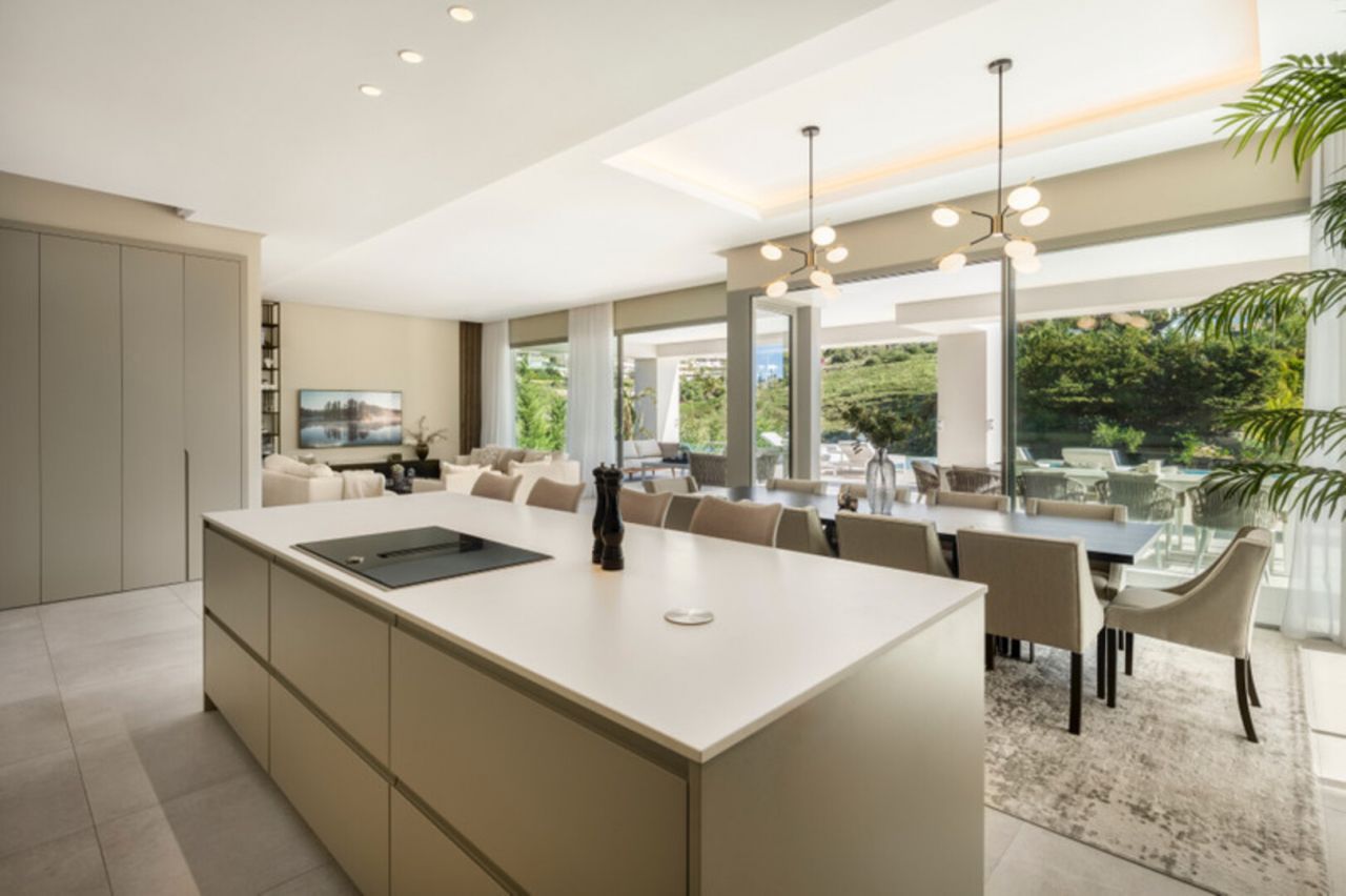 Zázrak moderní architektury, ideálně umístěný v prestižní oblasti Nueva Andalucia. Tato neuvěřitelná rezidence má východní orientaci, poskytuje dostatek slunečního svitu po celé dopoledne i odpoledne a také úchvatný výhled na okolí a majestátní horu La Concha. Villa Miranda se nachází na rozlehlém pozemku a nabízí prostornou terasu pro snadné stolování pod širým nebem, relaxaci a opalování, zatímco impozantní nekonečný bazén s nulovým okrajem dodává luxusu venku. Sluneční místnost v nejvyšším patře nabízí panoramatický výhled a vytváří další prostor pro zábavu a relaxaci, zatímco krytý přístřešek pro auto u vchodu poskytuje další pohodlí. Vstupte dovnitř a uvítá vás neposkvrněný interiér, který se vyznačuje otevřeným půdorysem v přízemí, který plynule propojuje různé obytné prostory. Integrace krásného LED stropního osvětlení a tlumených tónů do interiéru vytváří uklidňující a relaxační atmosféru. Skleněné posuvné dveře od podlahy až ke stropu vedou na palubu a poskytují vynikající bydlení uvnitř i venku. Kuchyně na míru, zdobená dřevěným truhlářstvím, tlumenými šedými skříňkami a kuchyňským ostrůvkem, je vizuálně přitažlivým a funkčním prostorem s dostatkem úložného prostoru a pultu. Díky moderním kuchyňským spotřebičům je vaření ještě pohodlnější. Horní patro je věnováno elegantně vybaveným ložnicím, hlavní ložnici s nádhernou šatnou a luxusní hlavní koupelně. Koupelna je vybavena dvojitým umyvadlem s LED osvětlením, samostatnou vanou a sprchovým koutem, čímž je zajištěna vysoká kvalita interiéru v celém domě. Hlavní ložnice vyzařuje styl a pohodlí s přímým přístupem na terasu a úžasným výhledem do okolí. Mezi další domácí vybavení patří venkovní posilovna, místnost s golfovým simulátorem, domácí kino a zábavní místnost, což přispívá k ztělesnění luxusního bydlení.