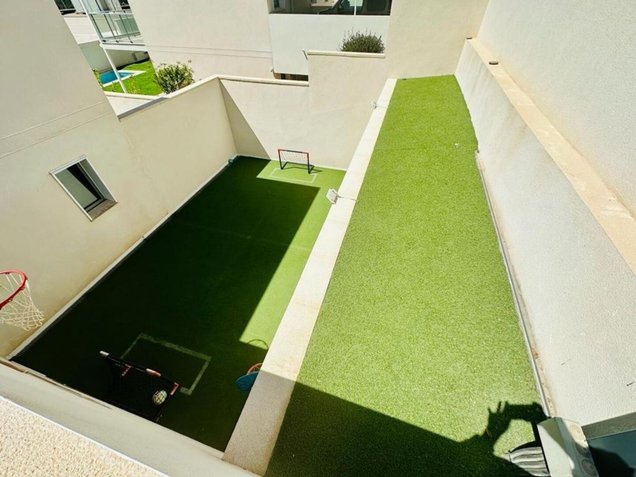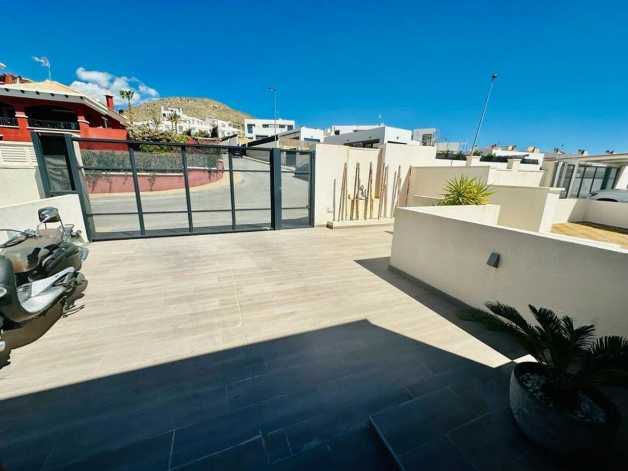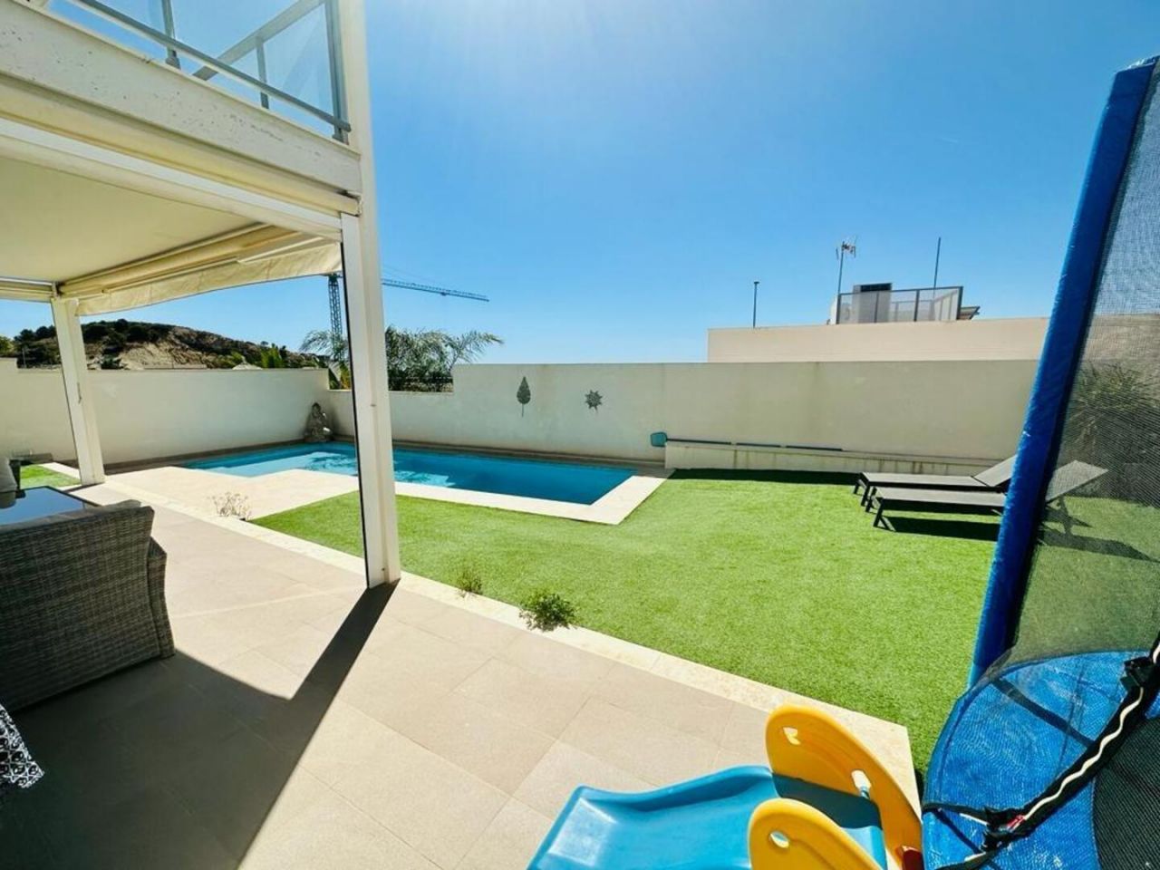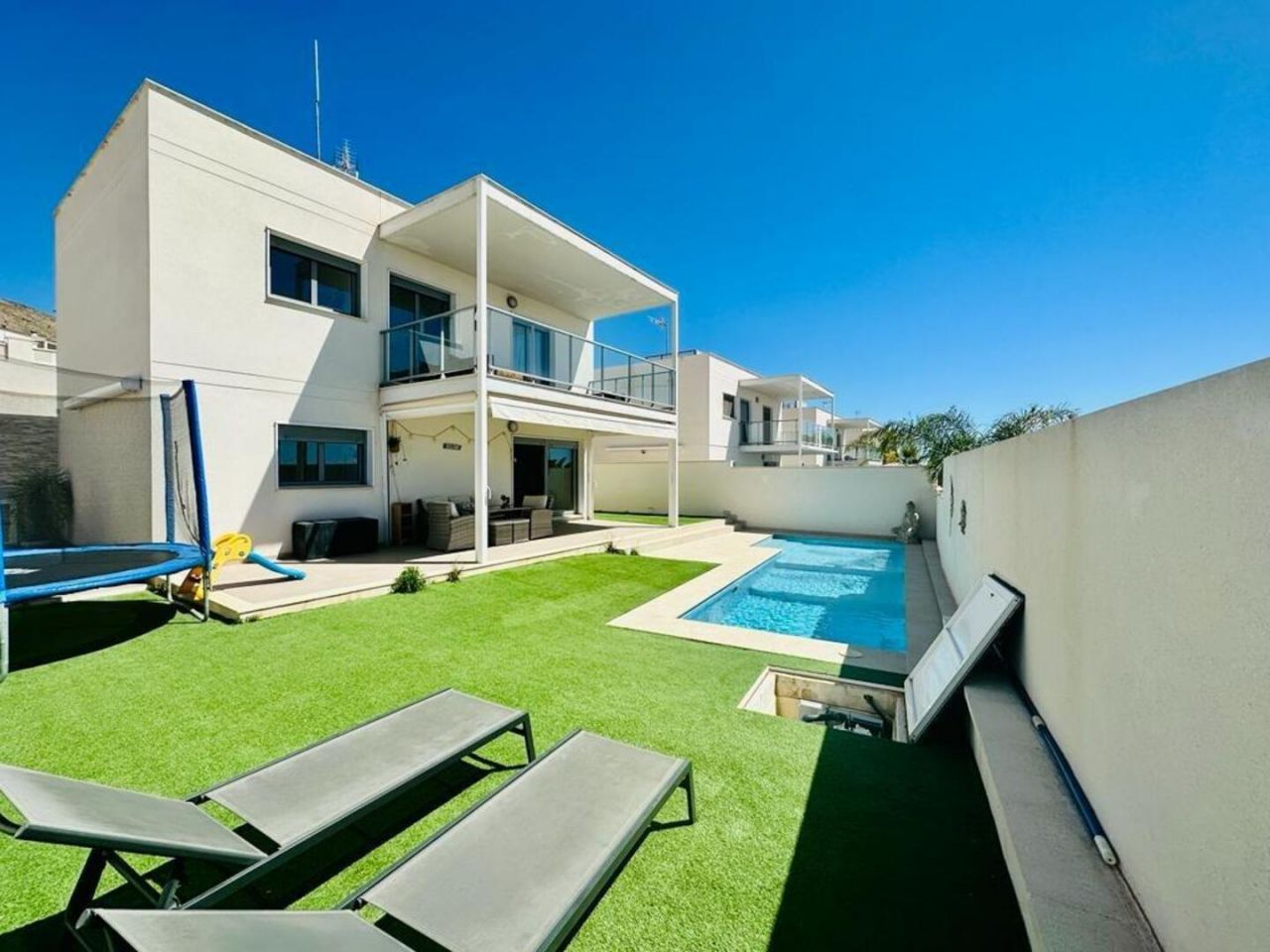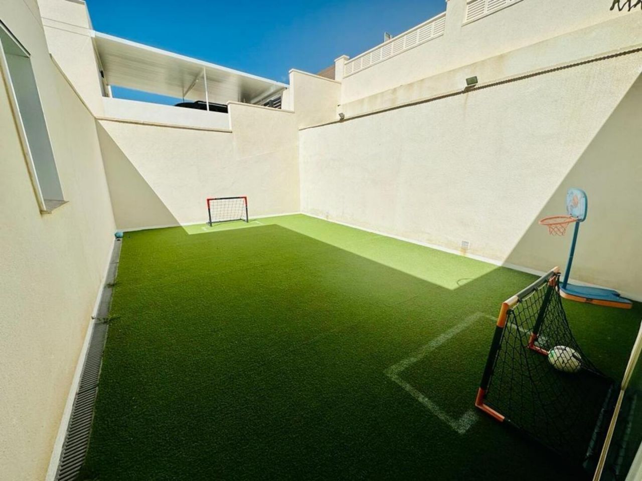 finestratTento nově postavený dům má avantgardní design, velký pozemek, soukromí a výhled na moře a hory Postaveno 150 m2 ve 2 podlažích: Přízemí: prostorný a světlý obývací pokoj se vstupem na krytou terasu, zahradu a bazén +. plně vybavená samostatná kuchyně (Architektura domu umožňuje odstranění příčky oddělující kuchyň od obývacího pokoje a vytvoření velkého, velmi moderního prostoru) + 1 plnohodnotná koupelna + 1 ložnice + multifunkční prostor (aktuálně hřiště/ tělocvična) + venkovní prostor s umělou zahradou pro aktivity venkovních sportů nebo pro děti na hraní uvnitř Velká zahrada, bazén a gril Horní patro: 3 ložnice + 2 koupelny. Hlavní ložnice s manželskou postelí, en-suite koupelnou a vstupem na krytou terasu, další dvoulůžkový pokoj a třetí jednolůžkový pokoj (aktuálně vybavený jako pracovna se vstupem na terasu). Všechny pokoje mají vestavěné skříně s vnitřní úpravou a velkou kapacitou. Nemovitost má parkování pro 2 auta a malou komoru. Pro zvýraznění jeho kvalit jsou laminátové podlahy v domě, porcelánová dlažba v koupelnách a kuchyni, studené teplo AACC potrubím odděleným rostlinami, markýzy na terasách, obvodové osvětlení, umělá zahrada, velký bazén s dětskou částí nebo chill-out , oplocení s termolamací a dvojitým sklem se vzduchovou komorou, pancéřové vstupní dveře, motorizované parkovací dveře, aerotermální energie pro samohybná děla Prodává se kompletně zařízený a s kuchyní vybavenou všemi elektrospotřebiči, ihned k nastěhování. Jižní orientace a výhled na moře a hory.