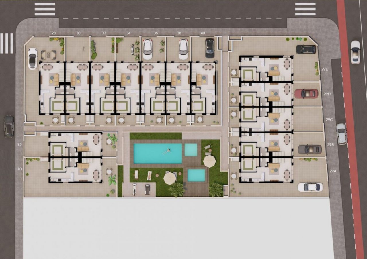 NOVÉ MĚSTSKÉ DOMY V PILAR DE LA HORADADA Nové moderní řadové domy postavené v klidné části Pilar de la Horadada, v blízkosti všeho, co potřebujete. Řadové domy mají 3 ložnice, 2 koupelny, otevřenou kuchyni, obývací pokoj s přímým vstupem do útulného bazénu, zadní terasu s parkovacím místem, terasu a velké střešní solárium. Pilar de la Horadada je typická španělská vesnice v nejjižnější části Costa Blanca. Velká hlavní ulice má supermarkety, různé obchody, restaurace a bary a také některá krásná náměstí. Krásné pláže Torre de la Horadada a Mil Palmeras s jemným pískem a promenádou jsou vzdálené pouhých 5 minut jízdy. Letiště Corvera (Murcia) a Alicante jsou vzdáleny 40 a 55 minut.