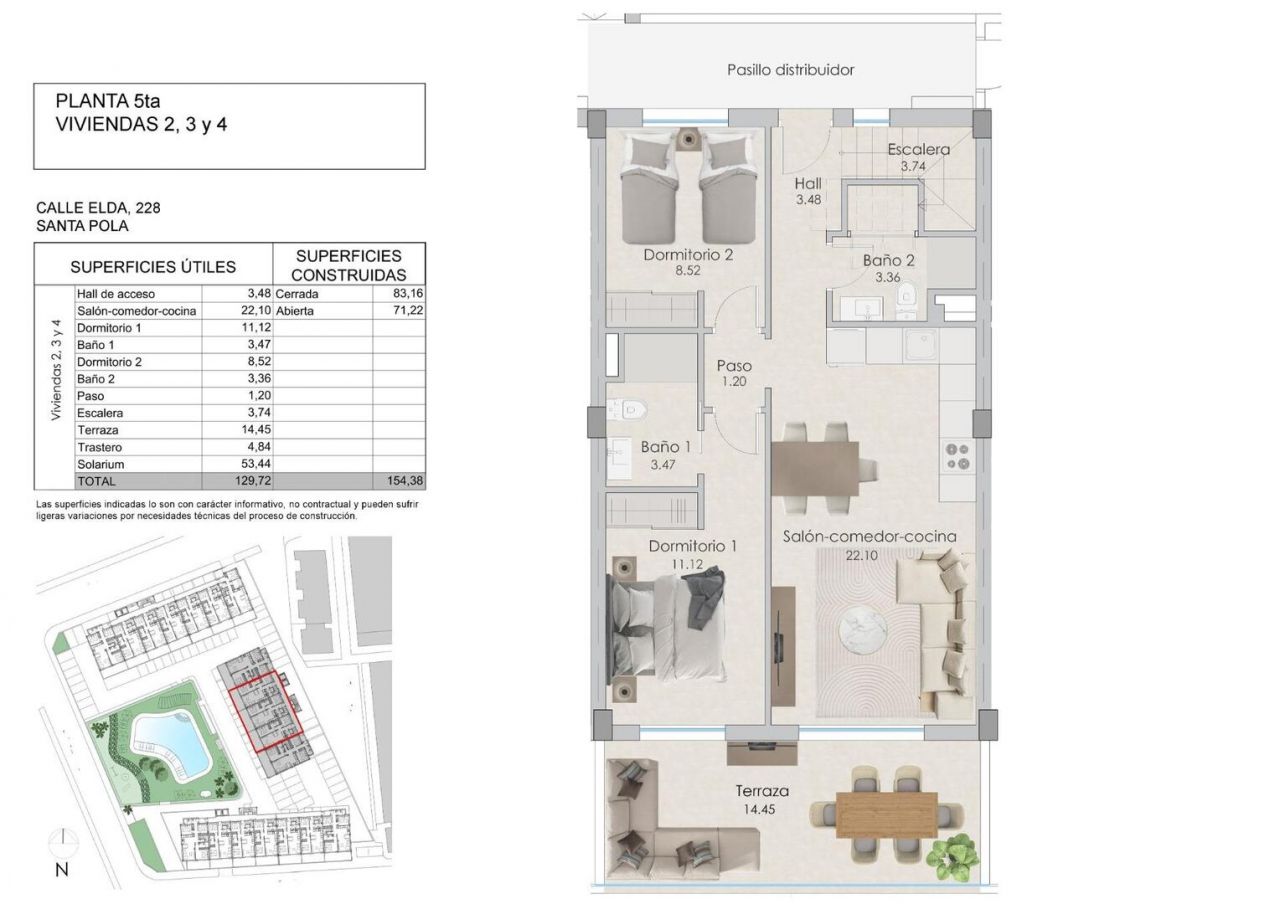 NOVÝ REZIDENČNÍ KOMPLEX V SANTA POLE Moderní uzavřený rezidenční komplex sestávající ze 3 bytových bloků s velkými upravenými společnými prostory včetně bazénu s vodními postelemi, dětského hřiště, altánku a parkoviště pro kola. Rezidenční komplex má byty 3 a 2+kk, oba typy mají 2 koupelny, otevřenou dispozici kuchyně s obývacím pokojem, vestavěné skříně, terasu, parkovací stání. K dispozici je společná zahrada, bazén se vstupem na pláž, vybavený sprchami a velký dřevěný altán. Území má upravené plochy s palmami a vegetací, všechny jsou osvětlené. V centrální části bazénu je mělčí plocha, kde jsou umístěna vodní lehátka. Obec Santa Pola se nachází na oblíbeném středomořském pobřeží Costa Blanca, jižně od Alicante a v regionu Bajo Vinalopo. Město má záviděníhodnou geografickou polohu, je obklopeno přírodní krajinou a má zvláštní mikroklima, které nabízí mírné klima po celý rok. Jeho městské centrum je ohraničeno na východě a západě hradní pevností a přístavem a na východě a západě je ohraničeno přírodním parkem Santa Pola Salinas, pohořím Sierra a Cabo de Santa Pola, starobylým útesem, který se dnes vyznačuje jeho útesové listí borovic. Santa Pola je 21 km daleko. z Alicante, hlavního města provincie s vynikající infrastrukturou a 15 km. z mezinárodního letiště Elche Alicante.