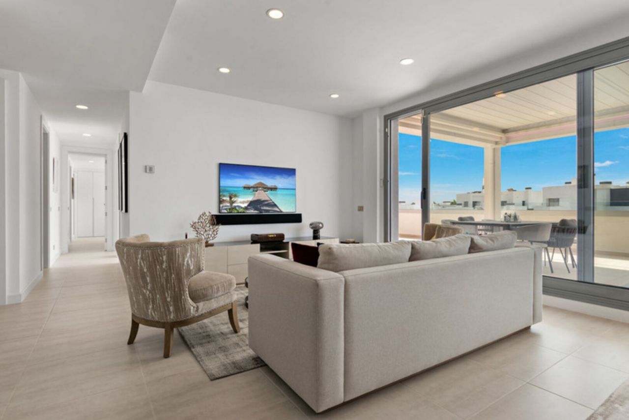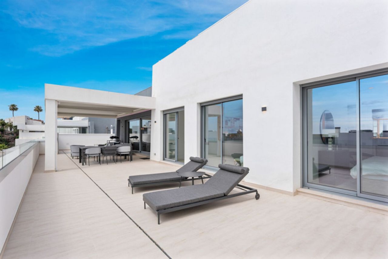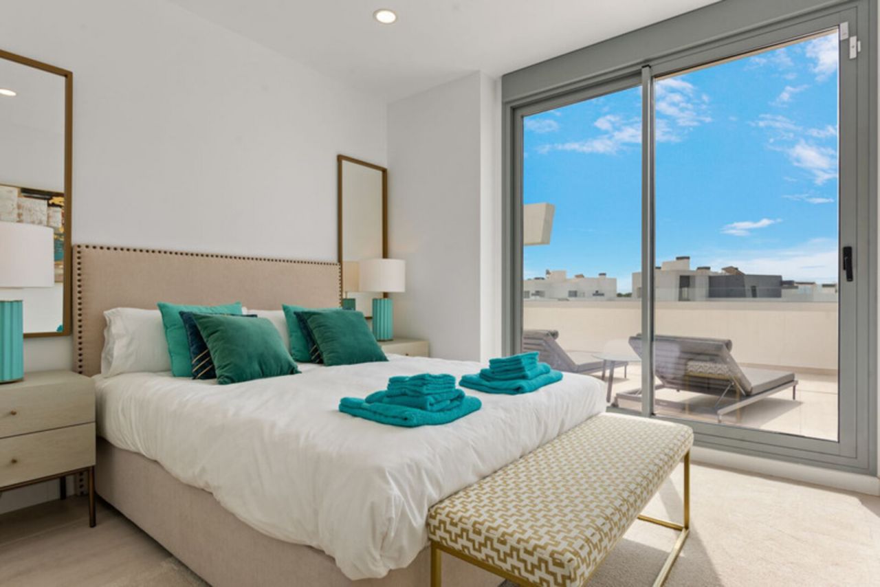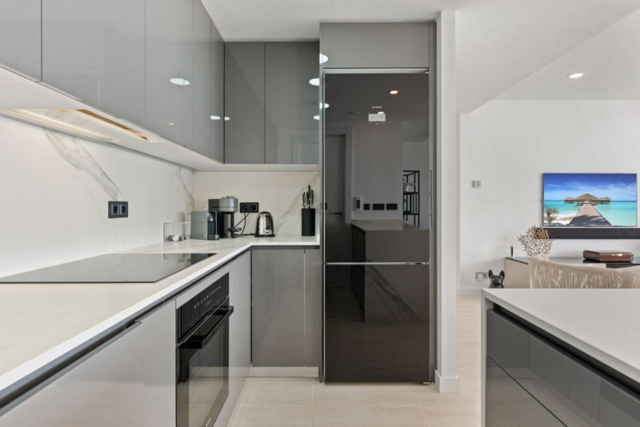 Dům má 3 ložnice a 2 koupelny, plus světlý a vzdušný otevřený prostor obývacího, jídelního a kuchyňského koutu s vysokými stropy a moderními zakázkovými skříněmi. Vyjděte z obývacího pokoje na velmi prostornou 134 m2 jižně orientovanou terasu s úžasným výhledem na Středozemní moře. Interiér: Modernizovaná kuchyně je vybavena veškerými moderními vymoženostmi včetně digestoře, mrazáku, skříněk s bílou technikou, sklokeramické desky, lednice, trouby, dřezu a myčky (exkluzivní spotřebiče Miele/Bosch). V koupelnách jsou sprchové kouty s vysoce kvalitním povrchem. Mezi další exkluzivní prvky tohoto penthouse patří vinný sklípek (3zónový vinný sklep Nodor), gril a pec na pizzu pro lahodnou zábavu. Vlastní šatna v hlavní ložnici s vlastní koupelnou a USB/USB c porty v každém pokoji. Terasa o rozloze 134 m2 má po celé ploše LED osvětlení, otevřenou bioklimatickou střechu, venkovní nábytek od Talenti, venkovní sprchu a gril, ideální pro relaxaci a setkávání. Zařízení je působivé, s několika bazény včetně dětského bazénu, posilovny a dobře vybavené posilovny pro cvičení. Budete mít také přístup do společného prostoru s kuchyní, ideální pro klidný pracovní prostor, pořádání narozeninových oslav, večeří nebo poskytování herního koutku pro děti. V současné době ve výstavbě a téměř dokončeno je součástí komplexu velké lázeňské centrum s krytým bazénem, saunou a koupelemi, dále kinosál a zábavní zóna. Tato nemovitost je ideální investiční příležitostí k trvalému či rekreačnímu bydlení i pro zájemce o pronájem nemovitosti. Nábytek je v ceně nemovitosti, vřele doporučuji prohlídku!!!