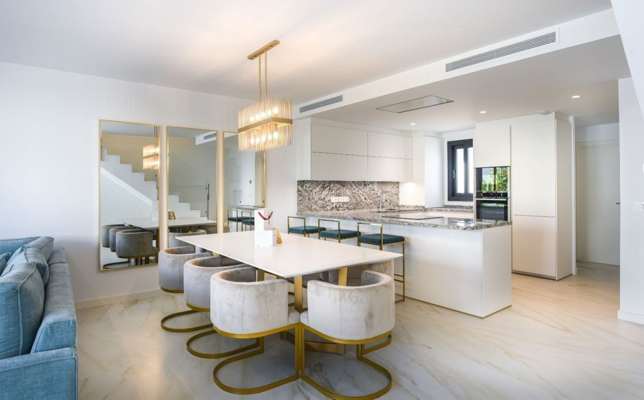 Vítejte ve ztělesnění vytříbeného života v Marein Village, Marbella. Nachází se v této prestižní komunitě pouhých 24 domů, představujeme nádherný městský dům se čtyřmi ložnicemi, který ztělesňuje sofistikovanost a pohodlí. Samostatně stojící a plně zařízený dům podle nejvyšších standardů nabízí bezkonkurenční kombinaci luxusu a funkčnosti. Při vstupu vás přivítá harmonický obytný prostor, který hladce spojuje současnou estetiku s vřelou a příjemnou atmosférou. Otevřený půdorys zdůrazňuje množství přirozeného světla a vytváří světlé a vzdušné prostředí v celém městském domě. Gurmánská kuchyně, zdobená špičkovými spotřebiči a elegantními povrchovými úpravami, je rájem pro milovníky kulinářství. Ať už bavíte hosty nebo připravujete klidnou rodinnou večeři, kuchyně je vybavena tak, aby vyhovovala vašim kulinářským potřebám.